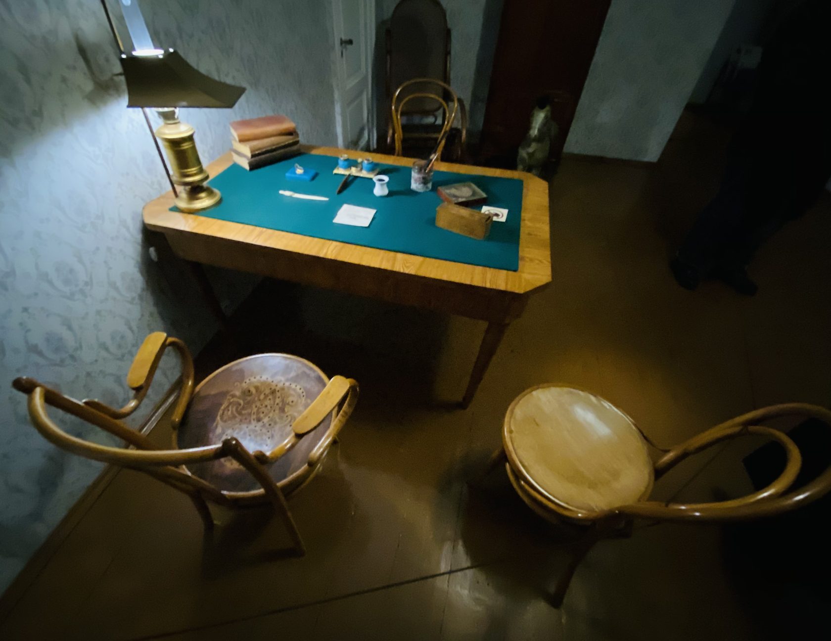 Я купил билет, поднялся наверх, на второй этаж и там в полумраке аскетичные интерьеры, старые вещи, конечно я выглянул в окно из которого смотрел погоду Фёдор Михайлович, конечно заглянул в кабинет, там стол за которым он работал и кушетку на которой тот засыпал, когда мысли окончательно спутывались, да подтверждаю, Достоевский был живой человек, как мы, а не портрет из кабинета Литературы.